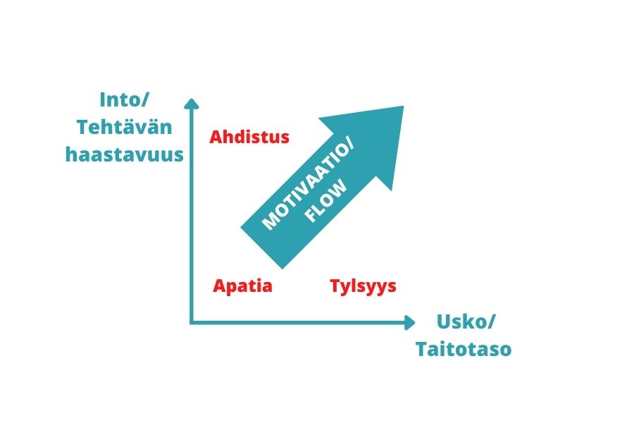 Motivaatiossa voidaan päästä eräänlaiseen putkeen, joka muistuttaa Flow-kanavaa. Flow-tilaan pääsee, kun haaste on sopivassa suhteessa vaativa omaan taitotasoon nähden. Mikäli haastetta ei ole tarpeeksi, ihminen kokee tylsyyttä. Jos taas taidot eivät tunnu riittävän, iskee ahdistus.